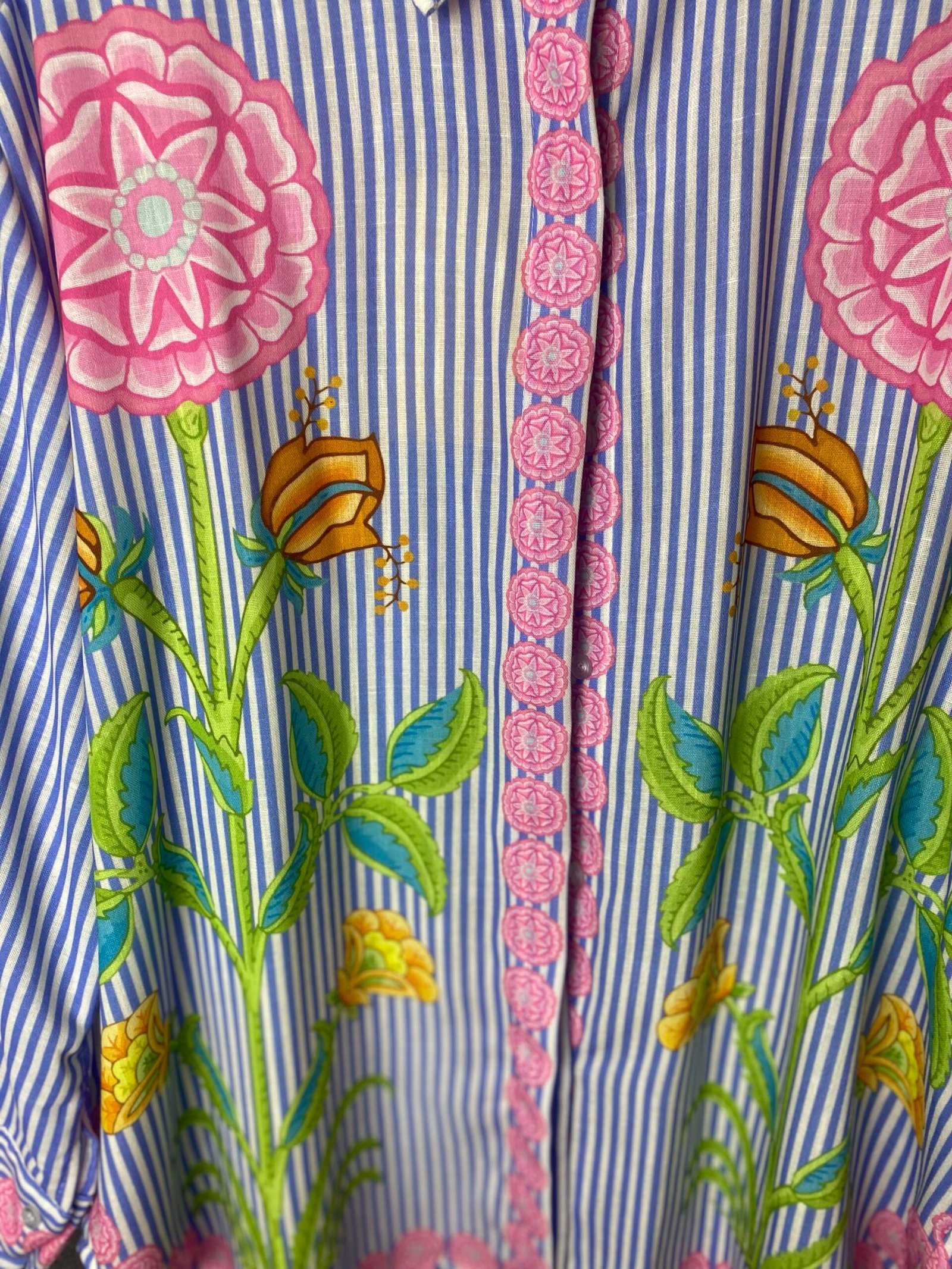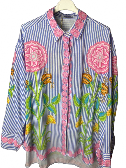 Blusa de rayas en tonos azul y blanco con bordados florales en colores vibrantes.