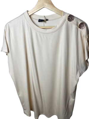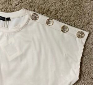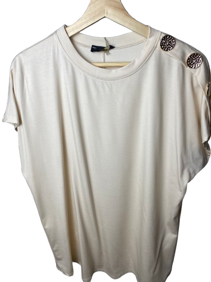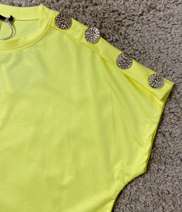 Su tejido ligero y fresco la convierte en una prenda ideal para los días soleados, mientras que los elegantes botones metálicos decorativos en el hombro añaden un toque moderno y sofisticado.