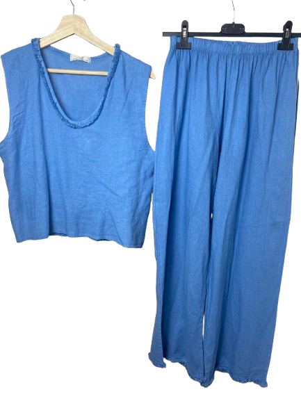Fabricado en una tela liviana de lino, este conjunto es perfecto para días de descanso, paseos veraniegos o una salida informal con estilo y confort.