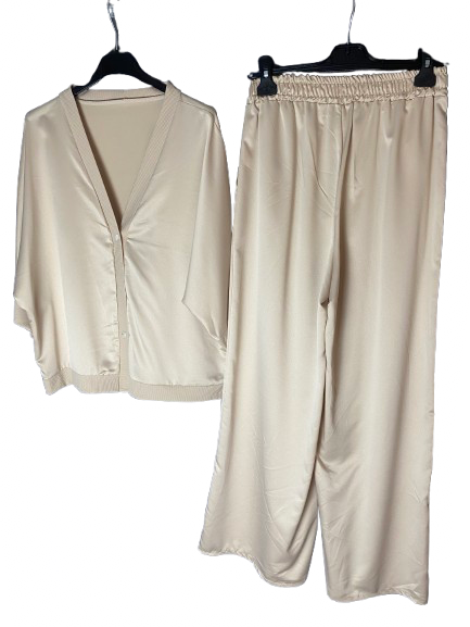 Conjunto elegante de dos piezas en satén beige, compuesto por blusa de manga suelta con botones frontales y pantalón fluido con cintura elástica.
